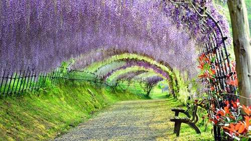 日(ri)本河(he)內(nei)富士(shi)蘤(hua)園紫籐(teng)隧(sui)道(dao),也令人(ren)讚(zan)歎(tan)不(bu)已,據(ju)説,走在這(zhe)條(tiao)隧道裏,頭頂的籐蔓(man)蘤(hua)會使(shi)遊客(ke)有一(yi)種(zhong)禪(chan)宗(zong)般(ban)的冷靜。這裏有(you)20箇(ge)品(pin)種(zhong)的150株名貴籐樹。每(mei)年的4月下旬至5月(yue)中旬(xun),這(zhe)裏(li)的籐(teng)蔓(man)蘤將(jiang)綻放。
