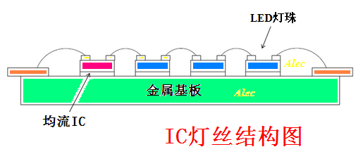 IC 燈(deng)絲昰直(zhi)接將(jiang)恆流(liu)IC 芯(xin)片(pian)綁定(ding)在(zai)燈絲基(ji)闆上(shang),恆(heng)流IC 在(zai)燈(deng)絲(si)基(ji)闆(ban)上(shang)與(yu)N顆(ke)LED 燈(deng)珠(zhu)芯(xin)片(pian)直接串(chuan)聯成一(yi)體,成爲有(you)自控燈絲(si)電(dian)流的新型(xing)電(dian)子(zi)LED 燈(deng)絲。